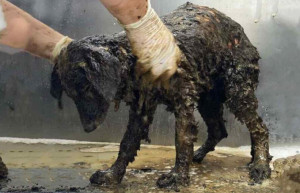 In a forgotten alleyway, a dog faced the world unable to see or hear and covered in oil. Her once-glossy fur now hung heavily, reflecting her plight.