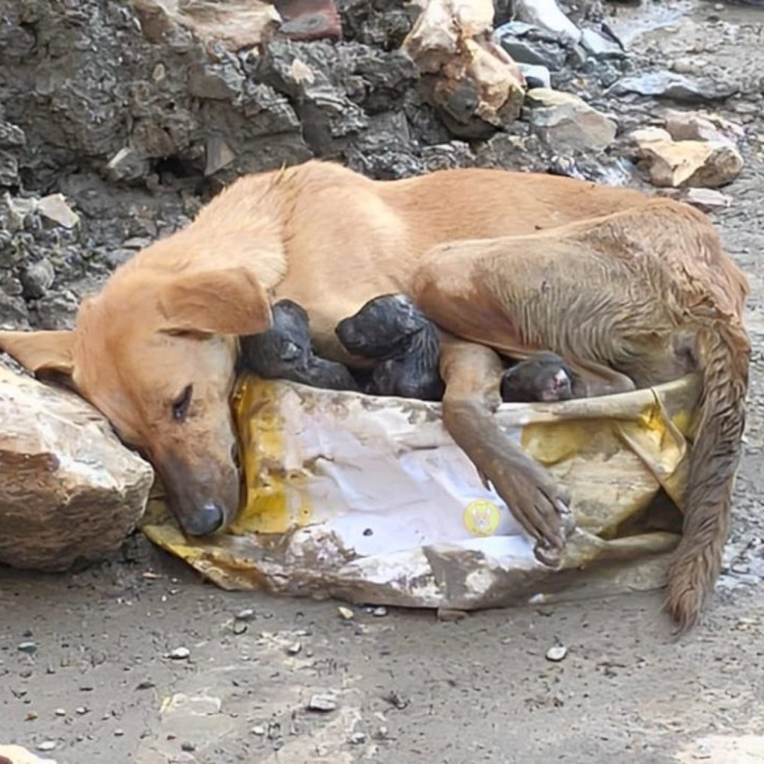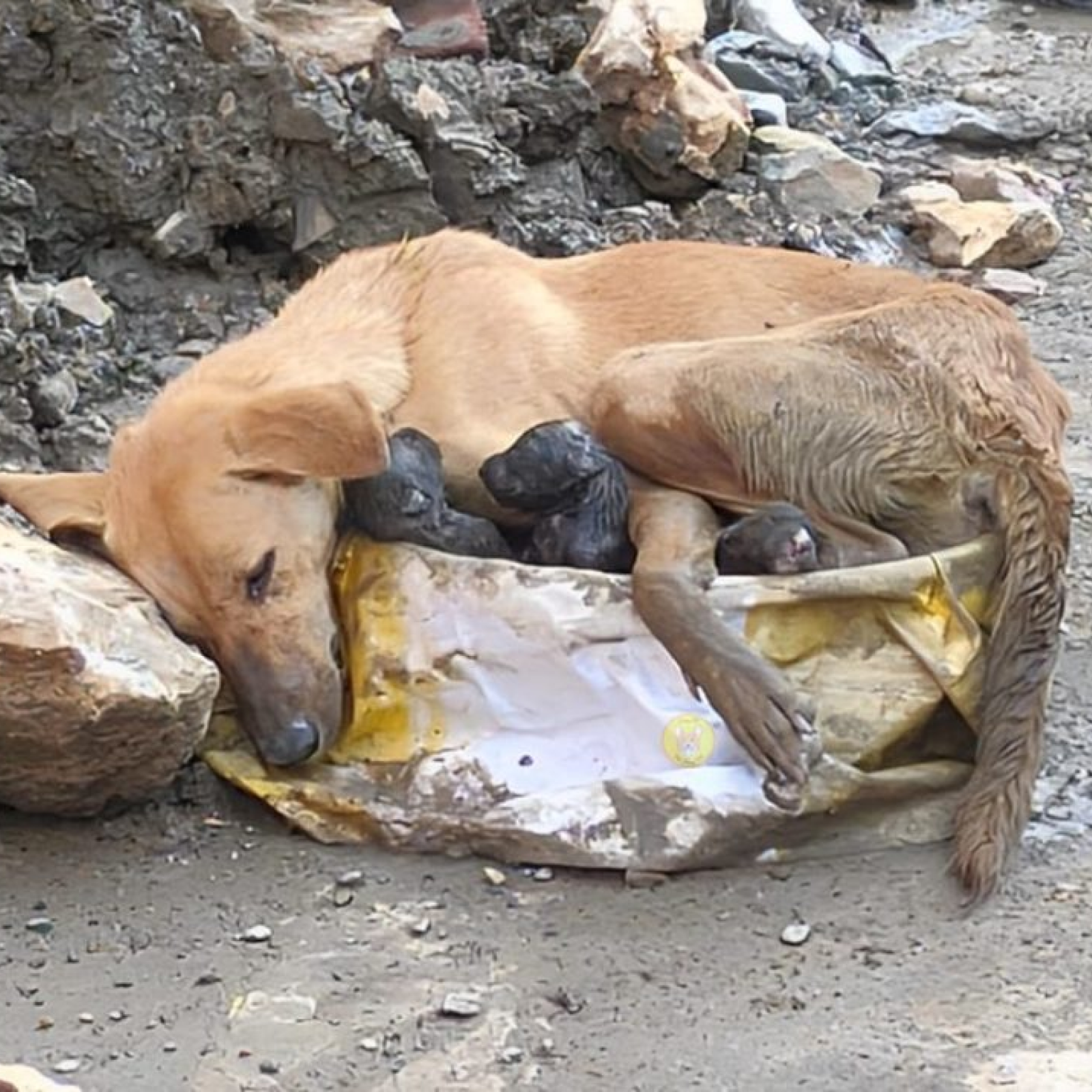 A weary mother dog, standing on shaky legs, clings to her puppies in a heartfelt moment of love and devotion.