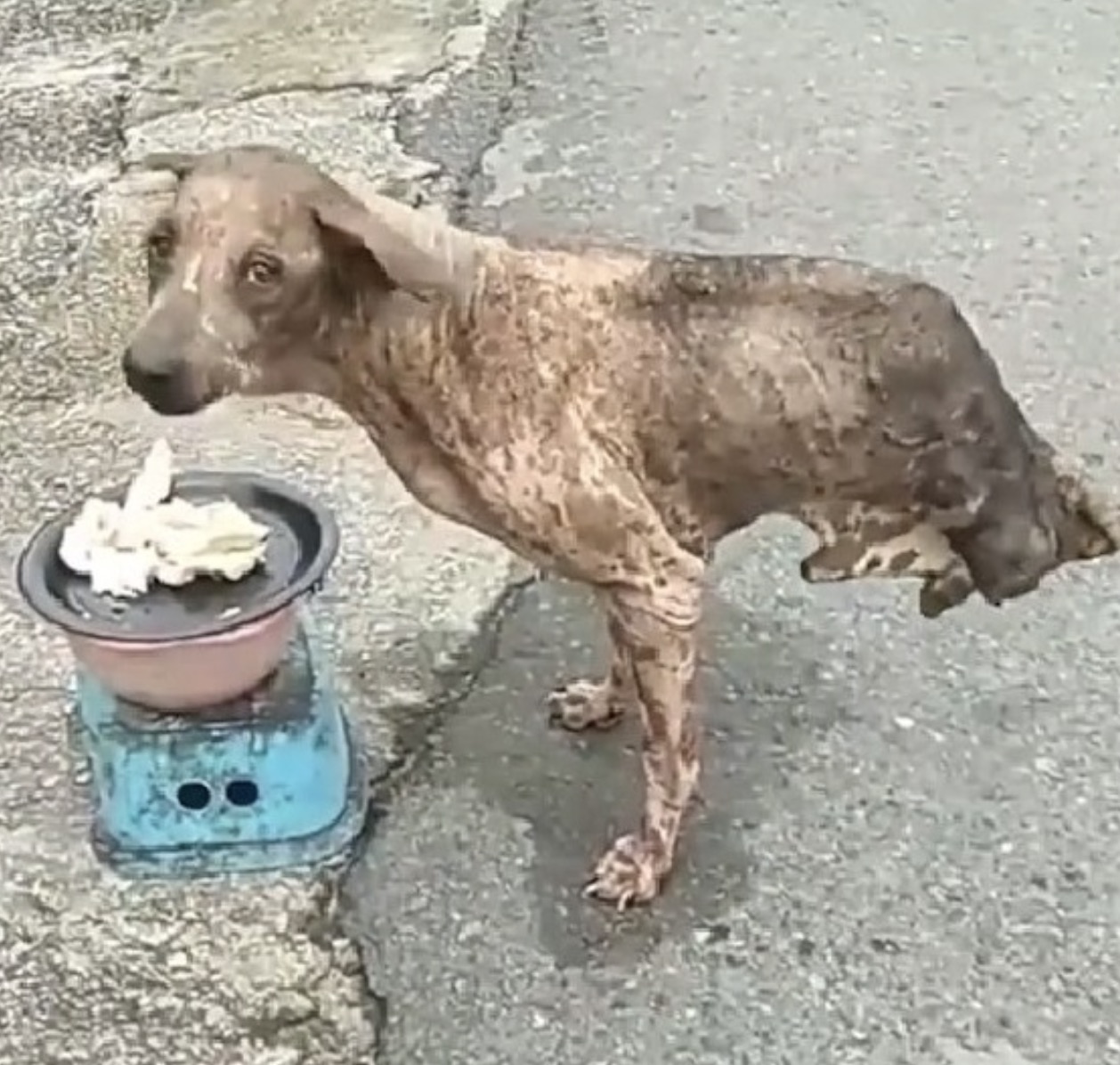 The dog seemed to have been ravenous for a while, although the meal used to be wonderful. The spectators’ solemn looks, fixed on the camera, destroy the viewers. The dog’s back legs were misaligned, but he was still standing on his other two legs.
