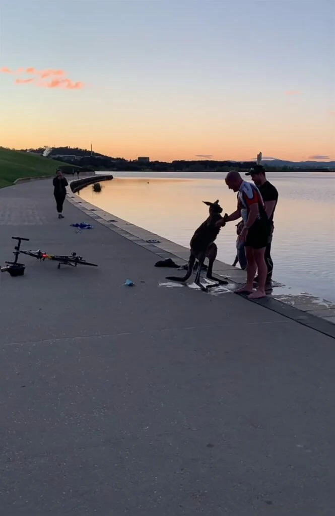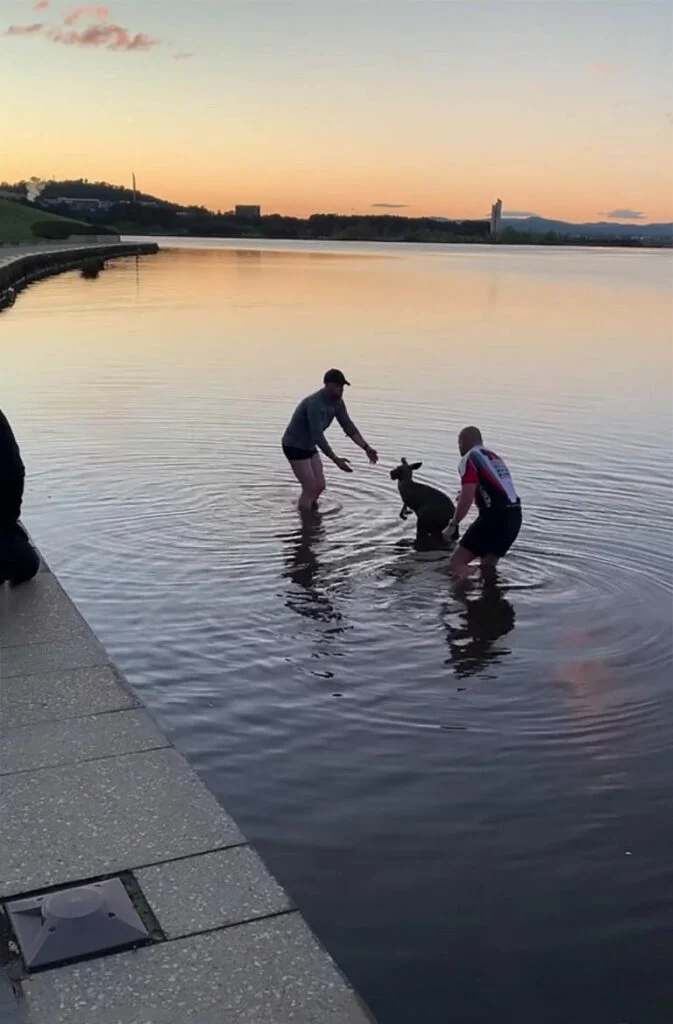 The poor kangaroo was still unsettled and frightened when one of the men came up next to him. Then another man slowly approached to help lift him up and put him out of the lake.