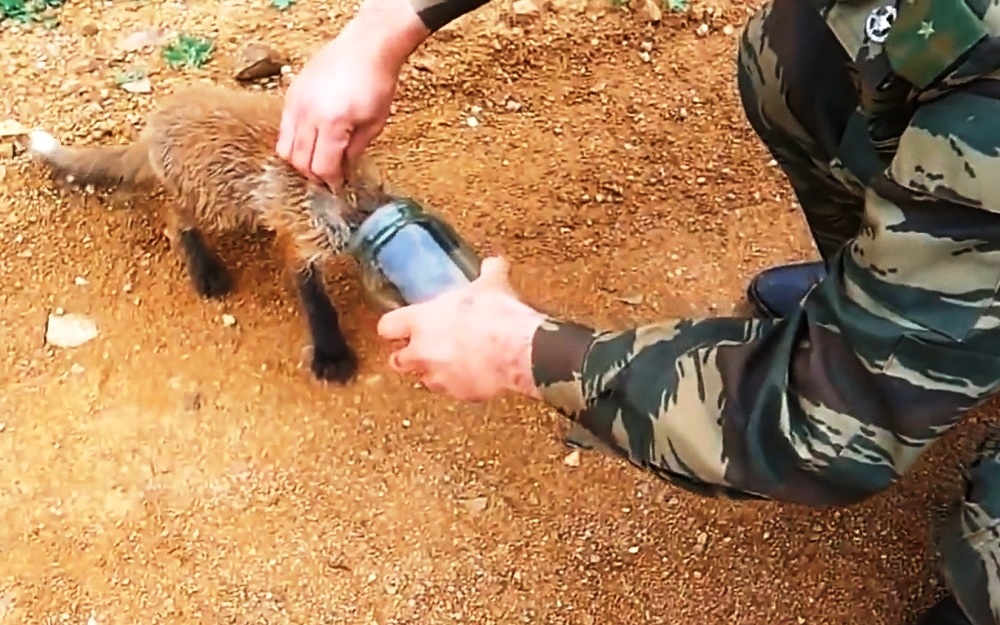 In this video, we see the one of the soldiers bending down to help the distressed fox cub. The little baby tries his best to remain calm as the soldier works to twist the jar out without hurting his neck. After some effort, the jar finally pops off while the relieved cub gasps for air! But the fox’s fear of humans kicks in again, and he immediately bolts toward the forest!