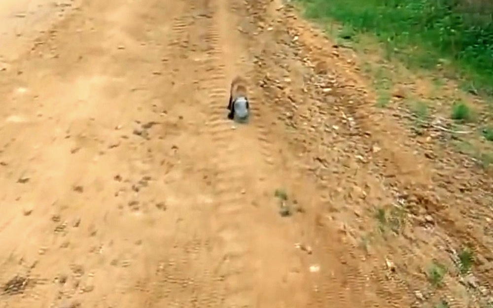 As the baby fox failed to get rid of the jar, he ran out of the woods and stumbled toward the dirt road in hopes of finding help.
