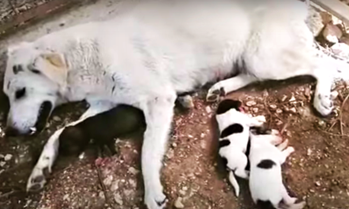 Flower gave birth to puppies! Even though she could hardly move herself, she still tried to care for her new babies. She did her best to clean the puppies off and get them to nurse. But her injuries were extensive. Flower struggled and the puppies were not going to make it.