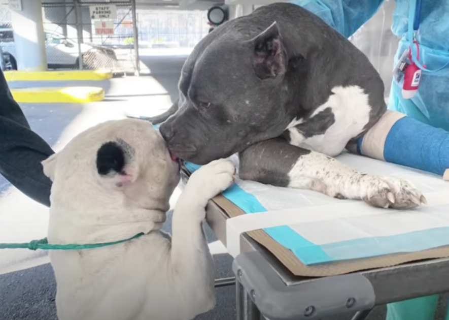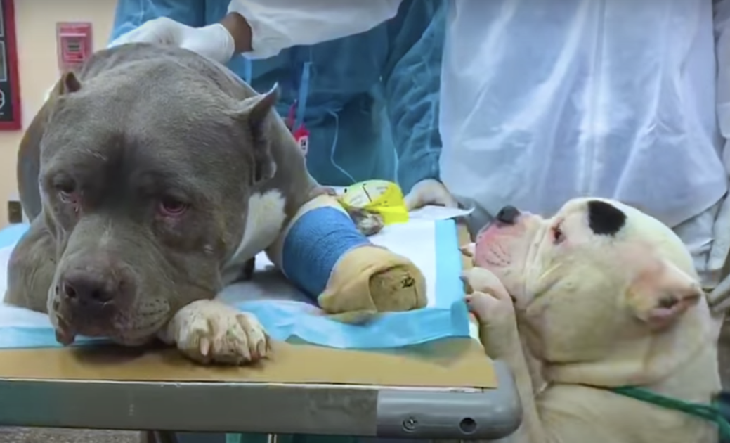 The two dogs were so scared. They had no idea what was going on. Through it all, though, they were glued to one another. It was in each other that they were able to find some comfort. The vet stabilized Tonka’s leg then loaded the Pit Bulls into the car and drove them back home to Long Island.