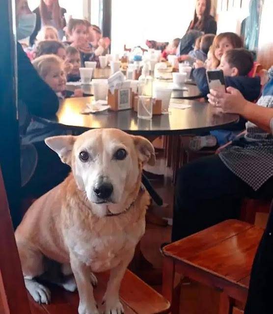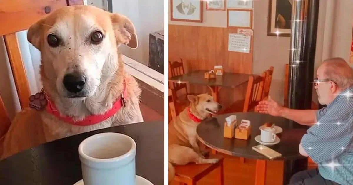 Dog adopted by a coffee shop sits with customers every day, try to keep them company