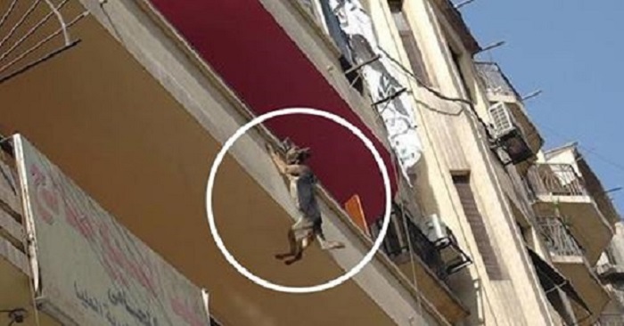 In the bustling streets of Cairo, Egypt, the inhabitants gazed upwards upon hearing heart-wrenching yelps. To their astonishment, a German Shepherd dangled precariously from a balcony on the third floor. The fact that the distressed dog could summon the strength to cry out for assistance was nothing short of remarkable.
