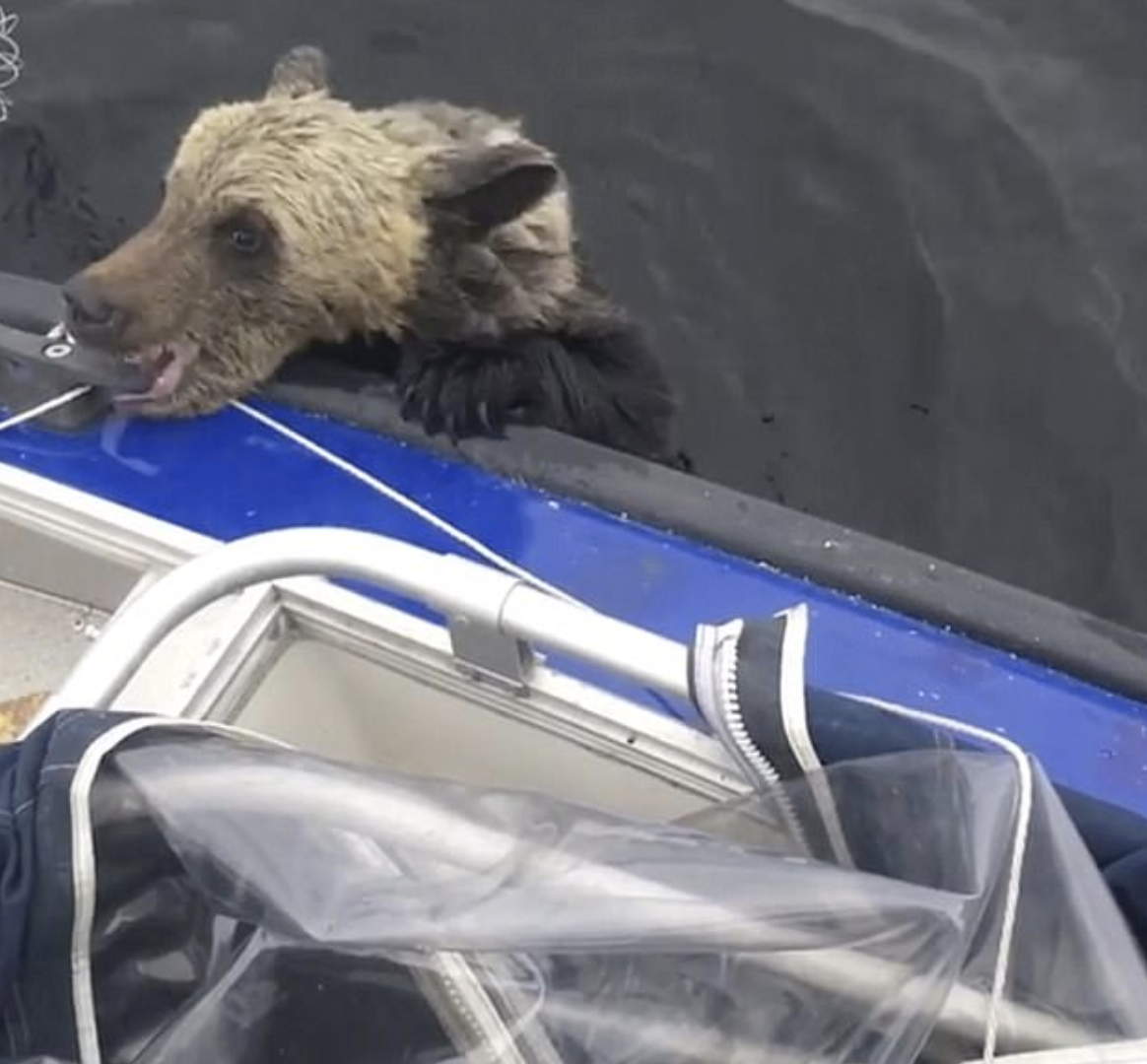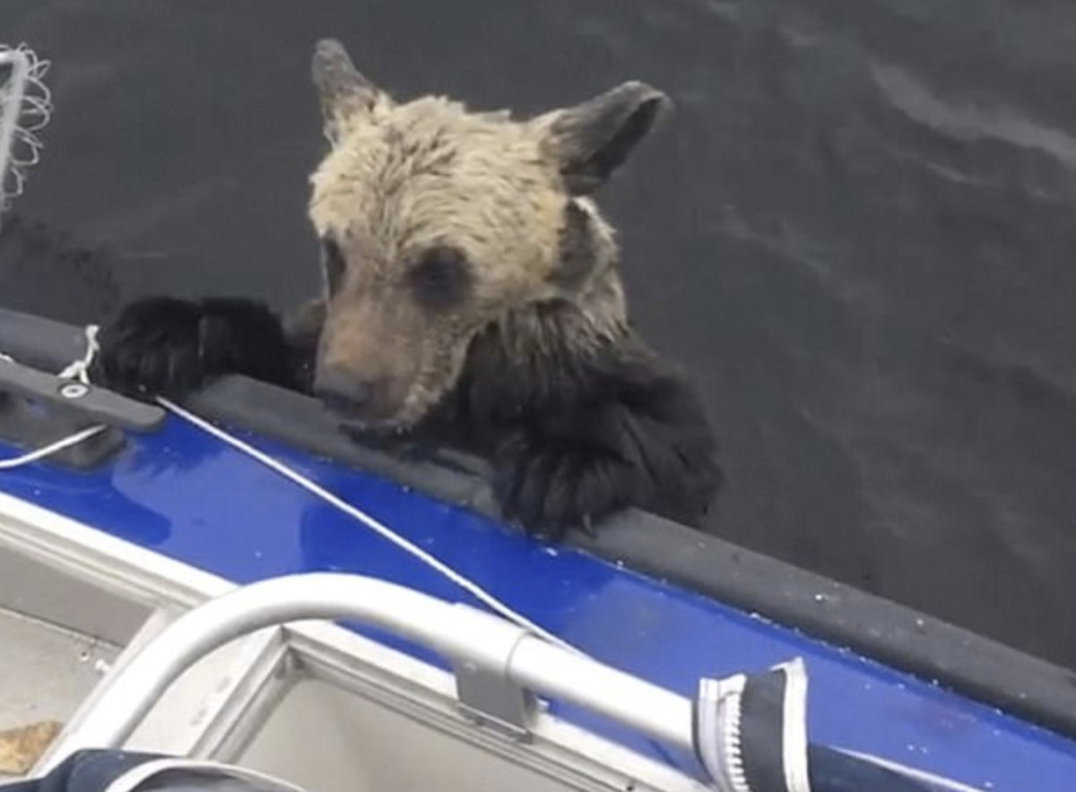 Now there was no time to waste! The waters were too cold and the cubs were too young to make it across on their own. Then, one of the cubs got close enough to the boat to put her determined little paws up on the side. She gripped the boat with her mouth as she tried to pull herself up. She tried with all her “beary” might to save herself but she kept slipping back into the water.