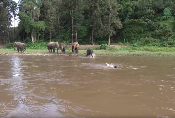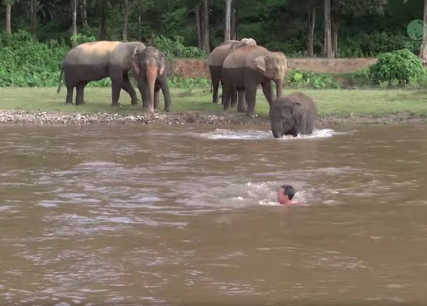 Without hesitation, an elephant approached him and drew him back; the elephant appeared hurried and concerned that he would be in dan.ger.