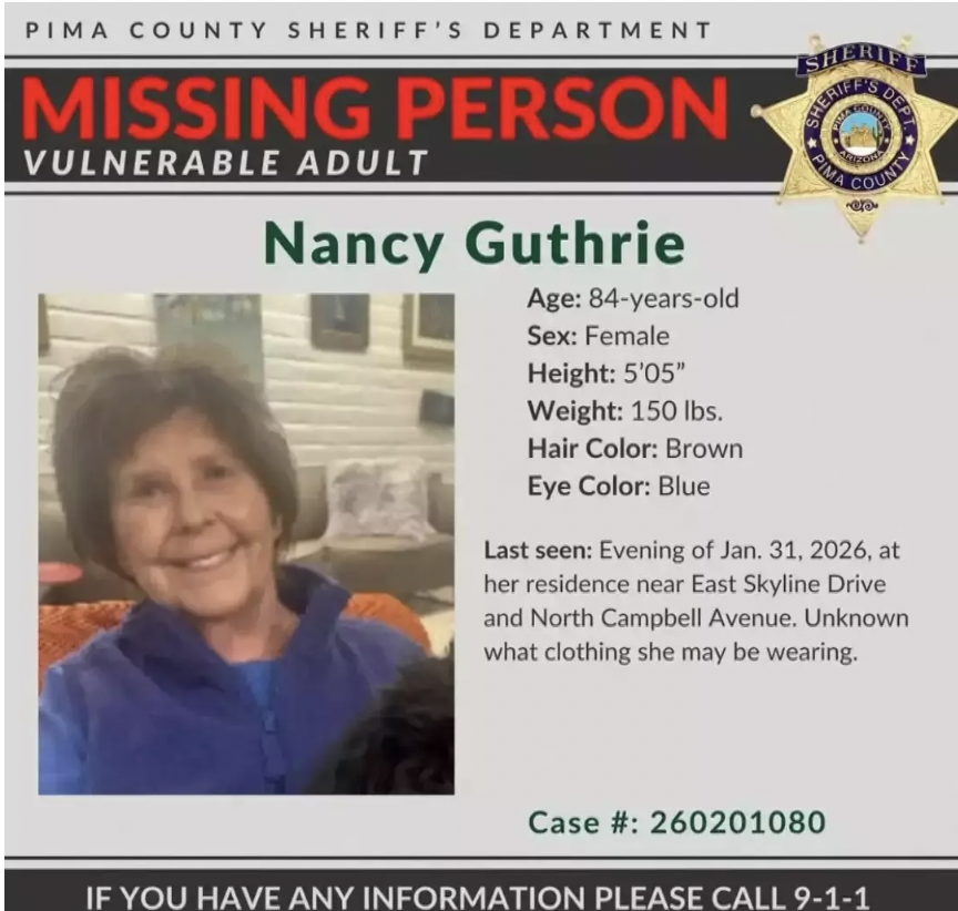 Nancy Guthrie, the 84-year-old mother of “Today” co-host Savannah Guthrie, was reported missing from her Tucson-area home on Sunday, Feb. 1. Authorities have said they are investigating her disappearance as a crime.