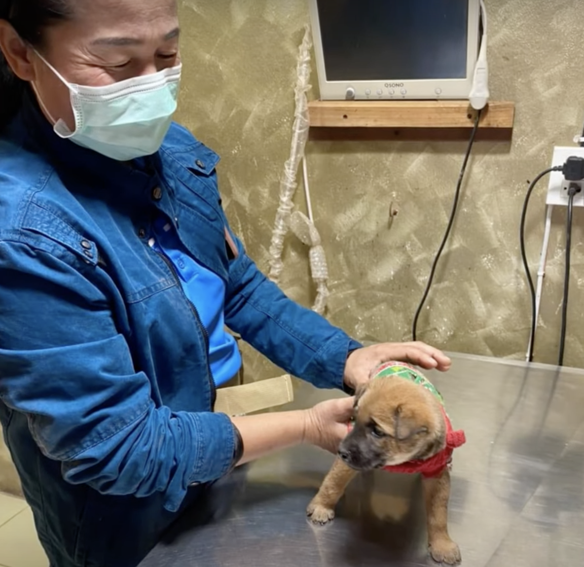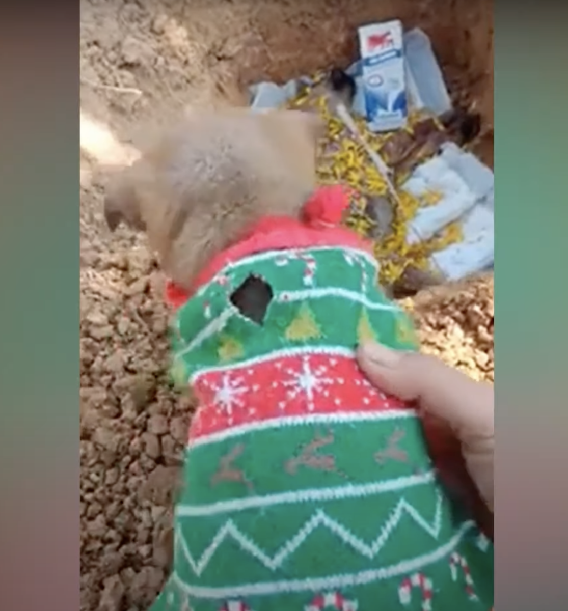 The woman is finally able to pick up the little boy. She asked her friends to give his sister a dignified burial. She brought the surviving puppy to the vet. After a thorough exam, and with the veterinarian’s permission, she brings the puppy to his sister’s funeral. She wants to give him a chance to say goodbye.