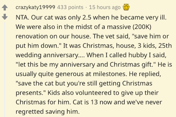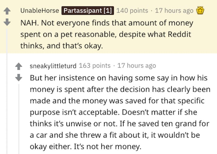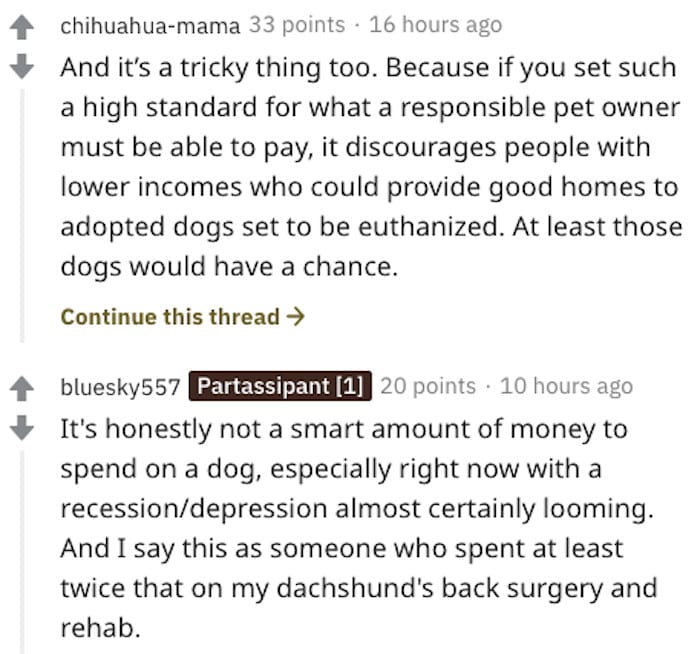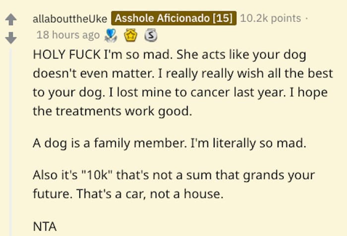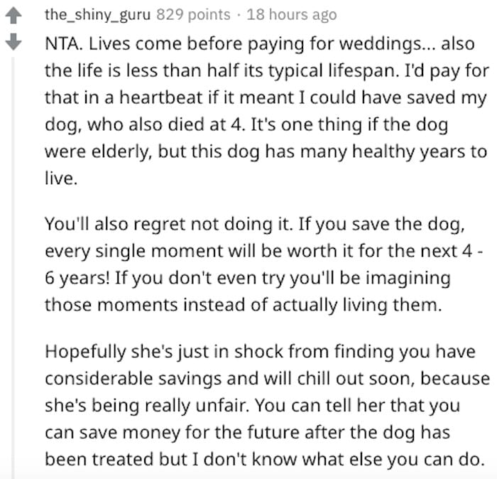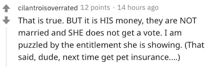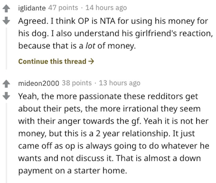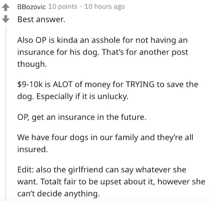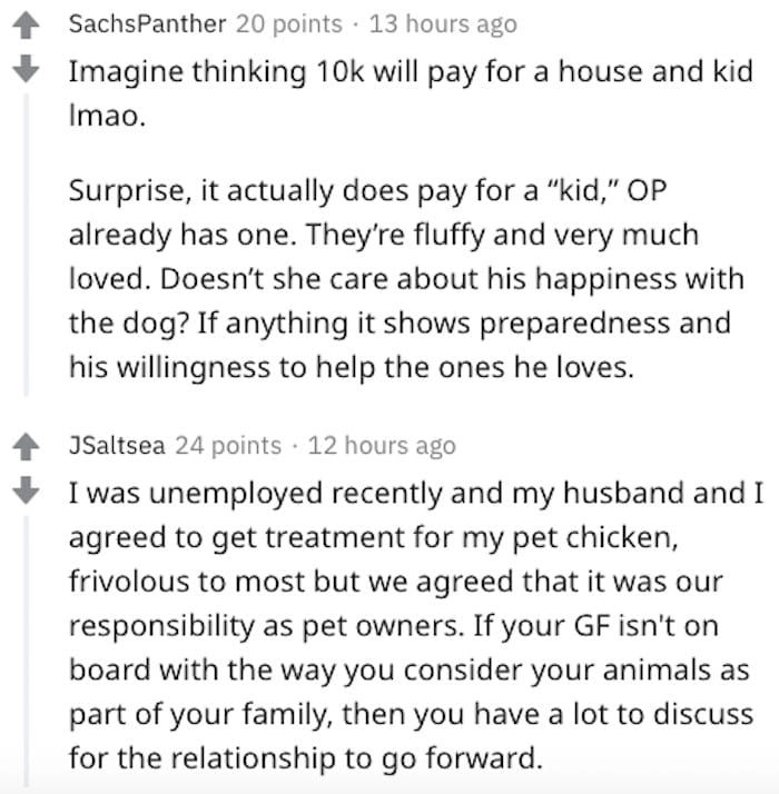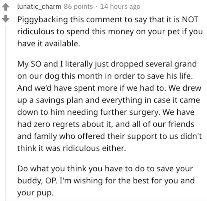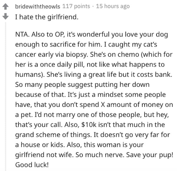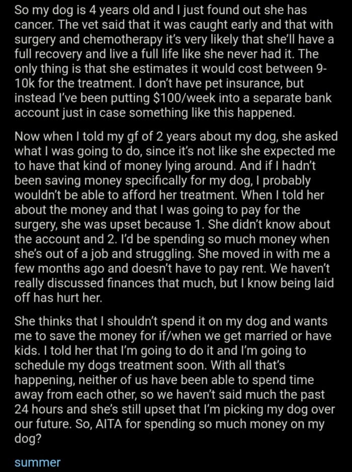 “Now when I told my gf of 2 years about my dog, she asked what I was going to do since it’s not like she expected me to have that kind of money lying around. And if I hadn’t been saving money specifically for my dog, I probably wouldn’t be able to afford her treatment. When I told her about the money and that I was going to pay for the surgery, she was upset because 1. She didn’t know about the account and 2. I’d be spending so much money when she’s out of a job and struggling. She moved in with me a few months ago and doesn’t have to pay rent. We haven’t really discussed finances that much, but I know being laid off has hurt her.