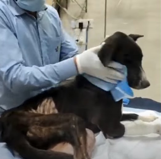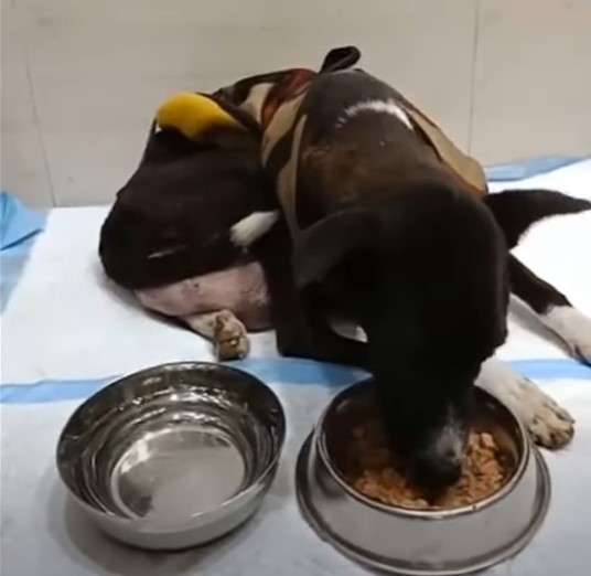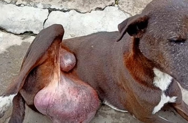 He was found laying on the side of the road unable to move with a gigantic tumor hanging from his stomach area.