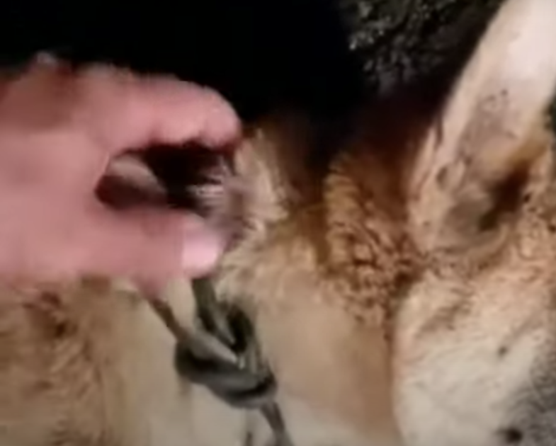 The pup was covered in wounds. He was very thin and scared. But the rescuer didn’t give up; he knew this dog needed saving. He does his best to keep up with the dog as the pup runs away. He’s finally able to catch him. With some help, he lies him down and sees he has a thick rope tied around his neck. The dog must have been struggling to breathe!