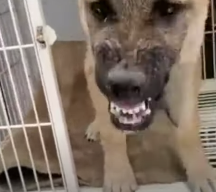The simple act of the man coming near the dog doesn’t go so well. The man does talk to the camera a lot and the dog is unaware of what is going on. But the pup is also traumatized. Someone had intentionally hurt him and it’ll take a lot of work for him to forgive humans. He growls and shows his teeth. He isn’t ready to be friends just yet.