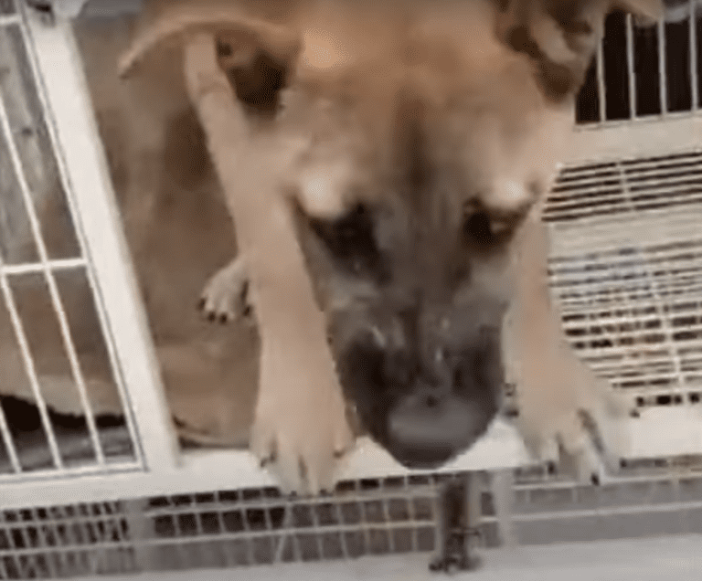 The young dog had been through some serious trauma. His body is proof of that as is his behavior. He is scared and because of his fear, he seems to be aggressive. But the kind man knows better. Once the dog is settled in at a medical clinic and is given his own kennel, the man who was saved him (and wants to foster him), comes over to say hello.