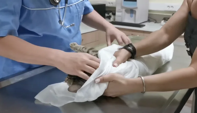 On the clinic, the devoted staff of execs wasted no time in evaluating the cat’s situation.