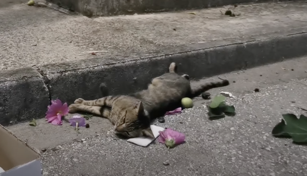 The cat lay close to a discarded cardboard field and some stray petals—remnants of a small bouquet that had tumbled from a close-by automobile window in the course of the chaos.