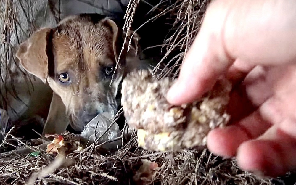 In this video, we see a rescuer approaching the mama dog while she is sheltering her puppies in a tiny den. As the raindrops heavily patter outside, the mama dog gets terrified when she sees the stranger reaching his hand out toward her. However, she doesn’t escape as she doesn’t want to leave her puppies alone.