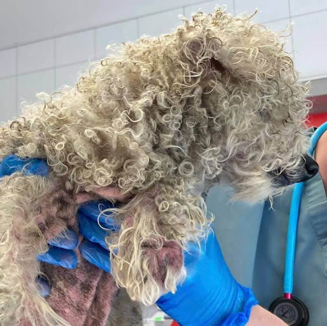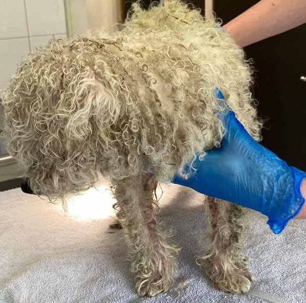 Upon examination, the dog, believed to be a Bichon, has severely inflamed skin from his paws to his shoulders and because of the apparent pain, didn’t want his rescuers touching him. Even his ears were so infected and sore, the dog – now dubbed “McDreamy” was filthy, matted with feces embedded into his coat and unable to see because the fur covered his eyes.
