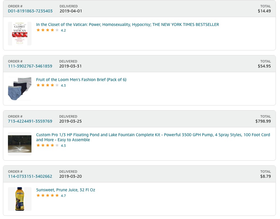 His most frequent purchase? Filthy Rich: The Jeffrey Epstein Story by James Patterson. Other titles included multiple biographies on Woody Allen and a series of books about President Trump, including Fire and Fury: Inside the Trump White House and Unhinged: An Insider’s Account of the Trump White House.