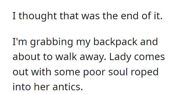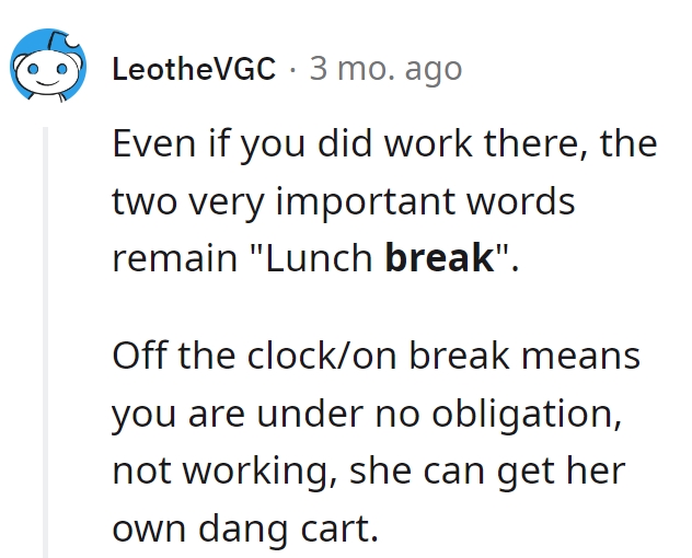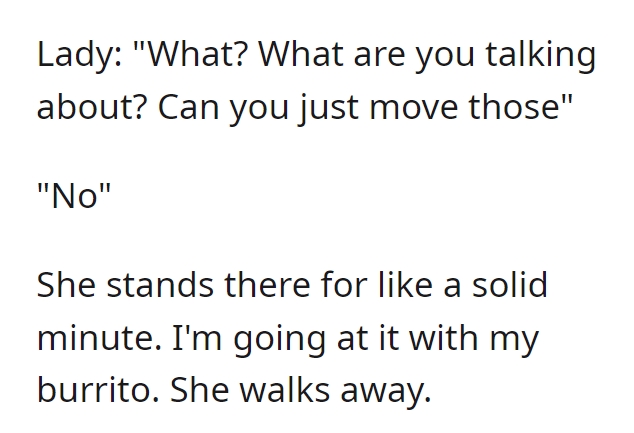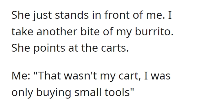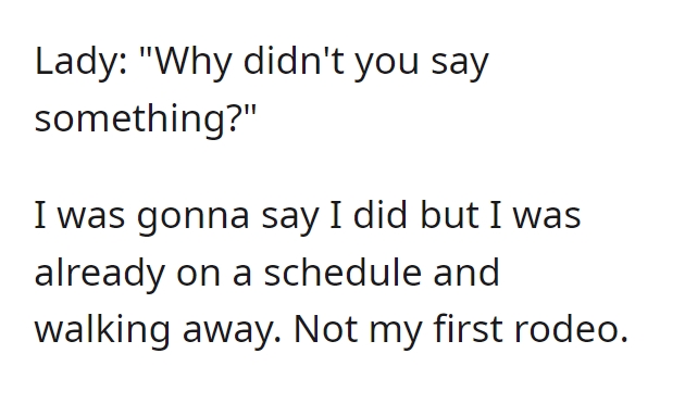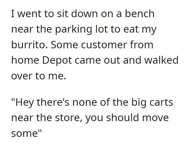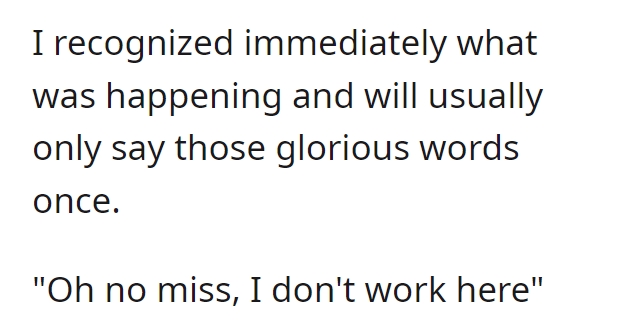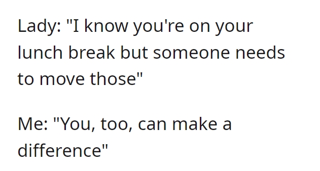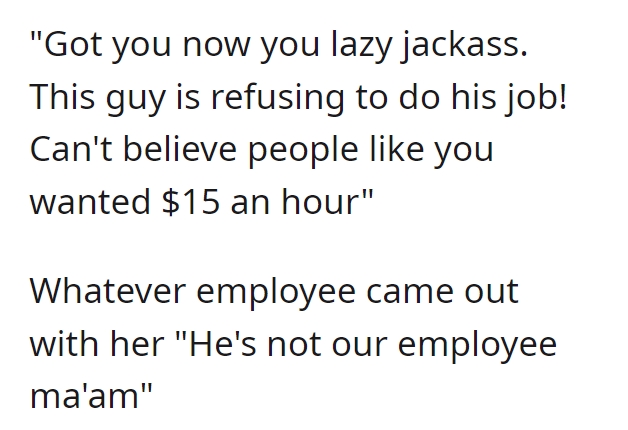 Remarkably, the protagonist maintains an admirable composure throughout the exchange. Were it me, I might have been inclined to unveil the dual nature of Karen’s conduct. Even if the protagonist were indeed an employee, their lunch break would warrant no interference. It remains perplexing what didn’t penetrate Karen’s stubborn resolve. Moreover, she interjects a tangential assertion about retail workers’ wages, a point utterly disconnected from the ongoing scenario. Invariably, such behavior is symptomatic of projecting one’s shortcomings onto others, thus reinforcing the adage “people often judge others by their own standards.”
