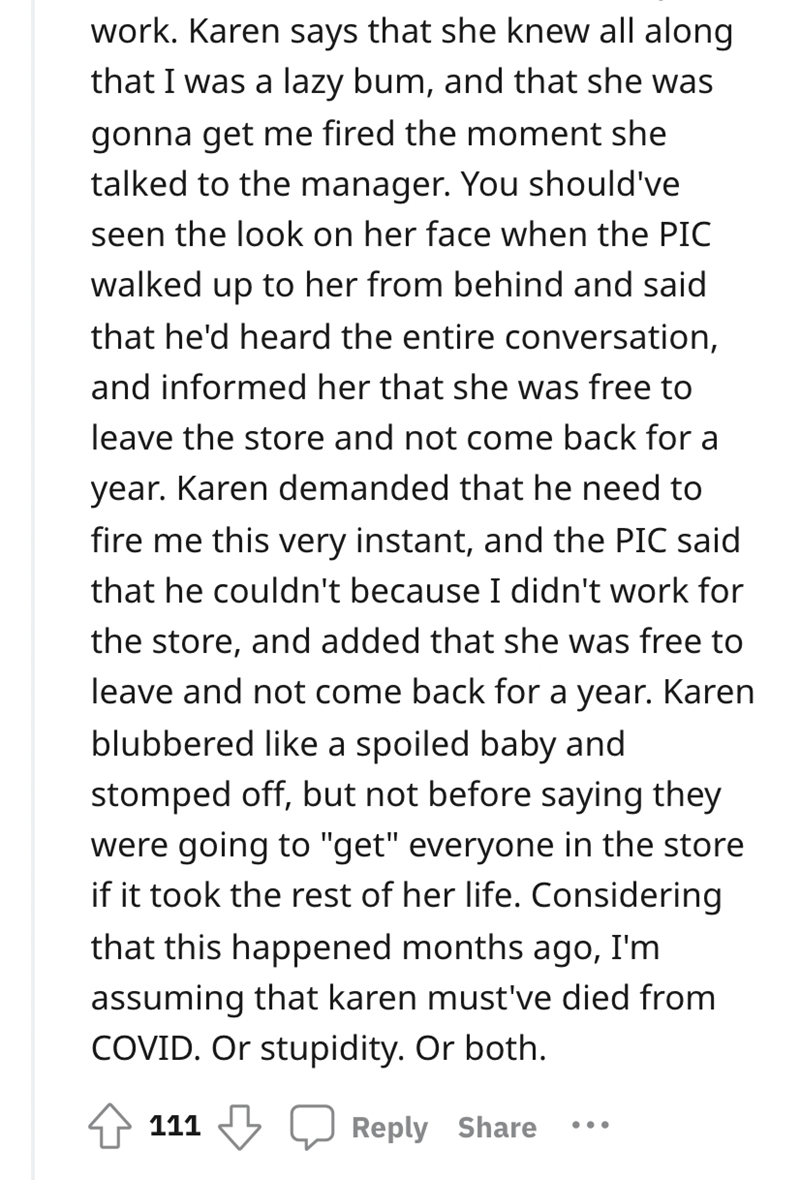 These types of Karens are often the ones resistant to wearing masks, which leads me to believe the latter scenario is indeed plausible.