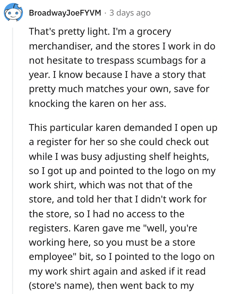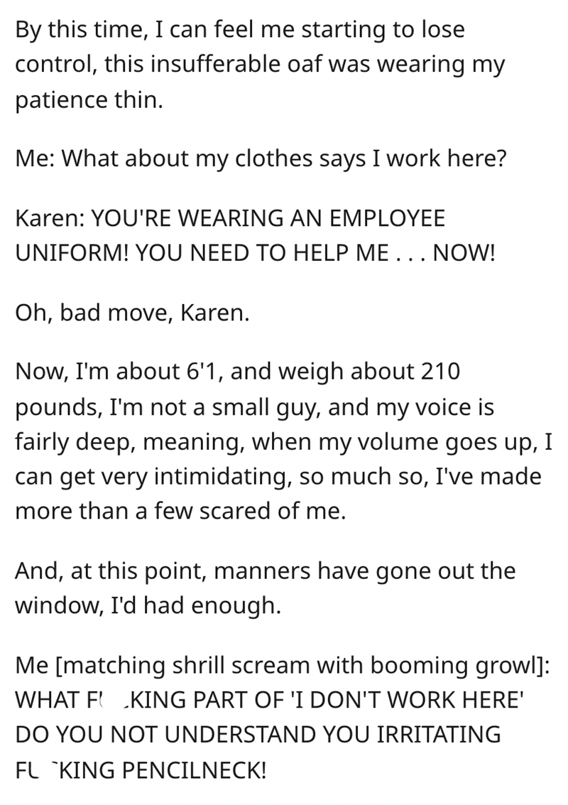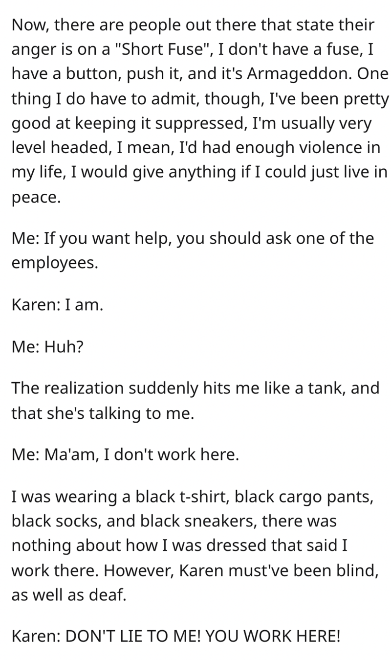 I find it puzzling how this perspective has taken root. We’ve encountered countless Karen anecdotes where they remain convinced that someone is deceiving them when they’re told, “I don’t work here.” Typically, employees are forthright, but somehow, Karens have seemingly crossed paths with so many untruthful individuals that they’ve grown cynical about everyone. What else could explain this behavior?