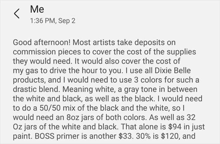 Evidently, the artist aimed to maintain a cordial tone while elucidating the cost breakdown for a vanity that was not up for sale.