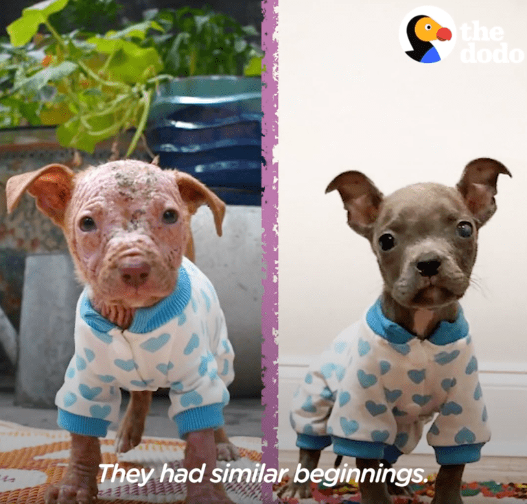 Daphne’s dog Elliot started out a lot like Pixie. He too had terrible skin issues. This is a photo of the dogs side by side! #Twinning