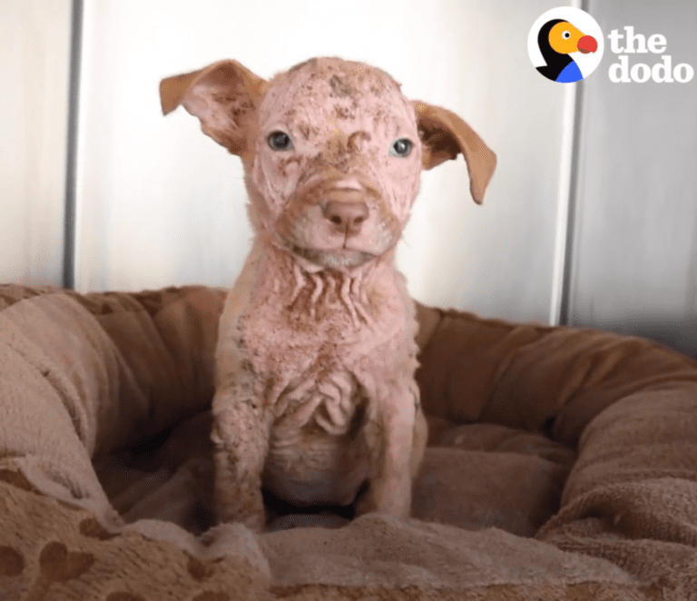 Her skin wasn’t actually burned but Pixie had a terrible case of mange. Her mange had gotten so bad that it invaded every spot on her tiny body. She was covered in bad sores from all her scratching. She was also malnourished. You could tell she would be a large breed dog and at only 6 weeks, she weighed only 4 pounds.