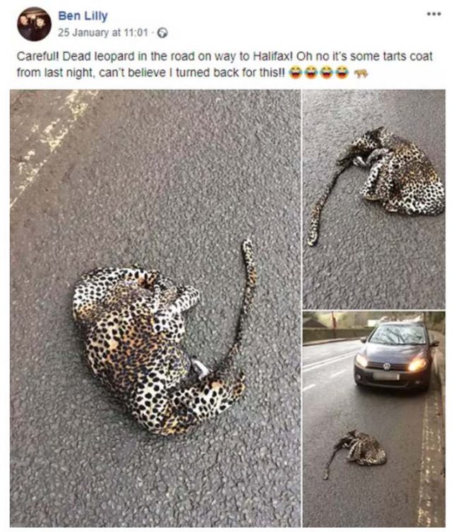 A 40-year-old man called Ben Lilly stopped his car after seeing a ‘leopard’, or at least what he thought it was, lying on the street with no sign of moving, writes pintiks