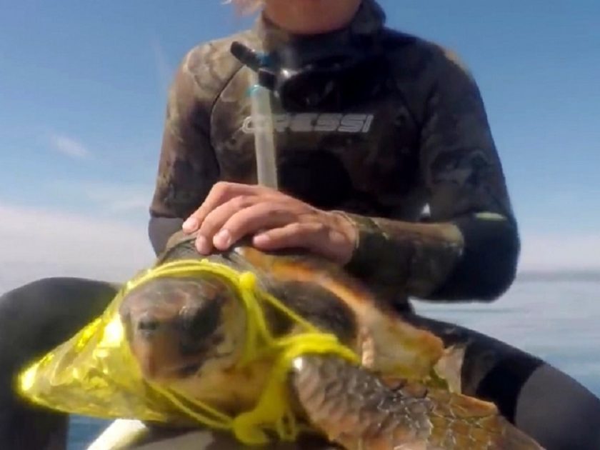 The sea turtle looked strong and healthy, so the pair released him back into the ocean. This is the second time Bryce and Angel have found a turtle tangled up in trash in the past few months, and they claim that the ocean is filled with discarded balloons that threaten marine life.