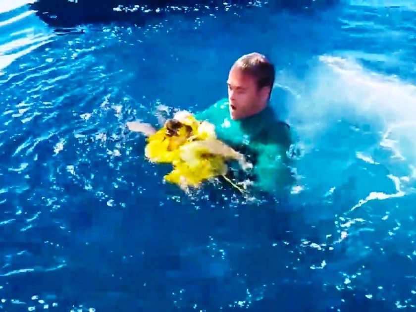 In this video, we see Bryce jumping into the ocean to save the sea turtle who was rendered motionless. His head and front flippers were tangled in the balloon, and his back flippers were cinched tight within its strings. Bryce and Angel rescued the turtle and carefully clipped off the tangled sections of the balloon.