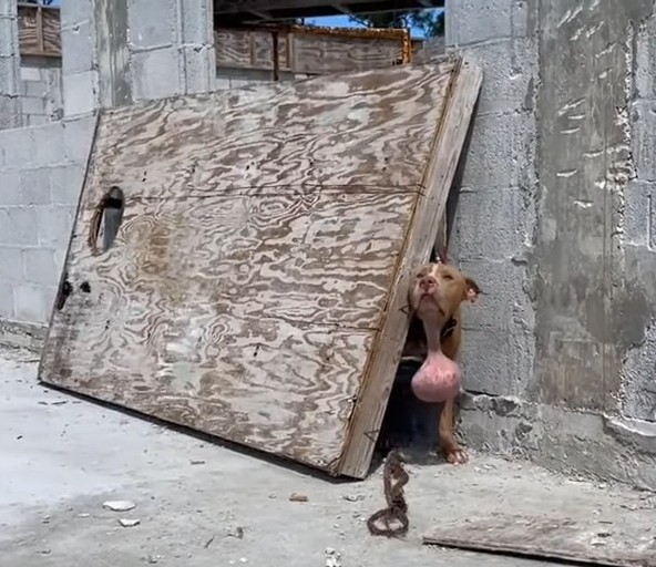 The poor animal, tethered by an extended cable round its neck, was additionally burdened with a big tumor. Fearful and skittish, the dog sought refuge behind a panel in an deserted constructing.