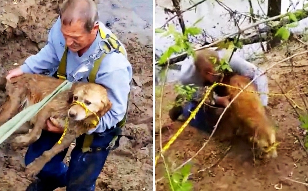 Johnny took the help of a friend and slid down the slippery slope to get to Ginger. He petted the scared dog and began loosening her paws from the muddy hold. After much difficulty, Johnny lifted her up and secured her in his arms. But just when he began ascending back to safety, he slipped on the soggy ground and fell.