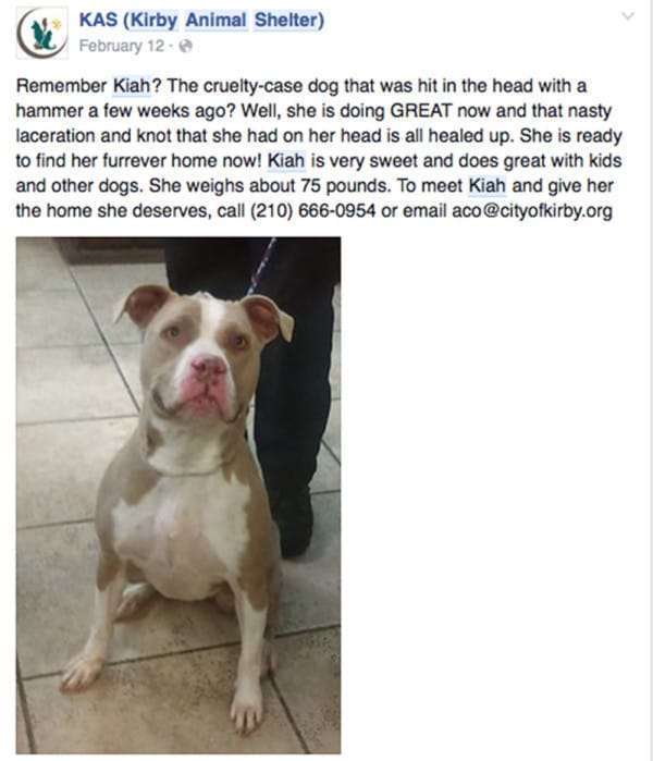 The Kirby Animal Shelter wrote on Facebook, “So proud of our Kiah! She [is] setting the bar high by proving that pit bulls can make our neighborhoods safer, not more dangerous… Way to go Kiah!”