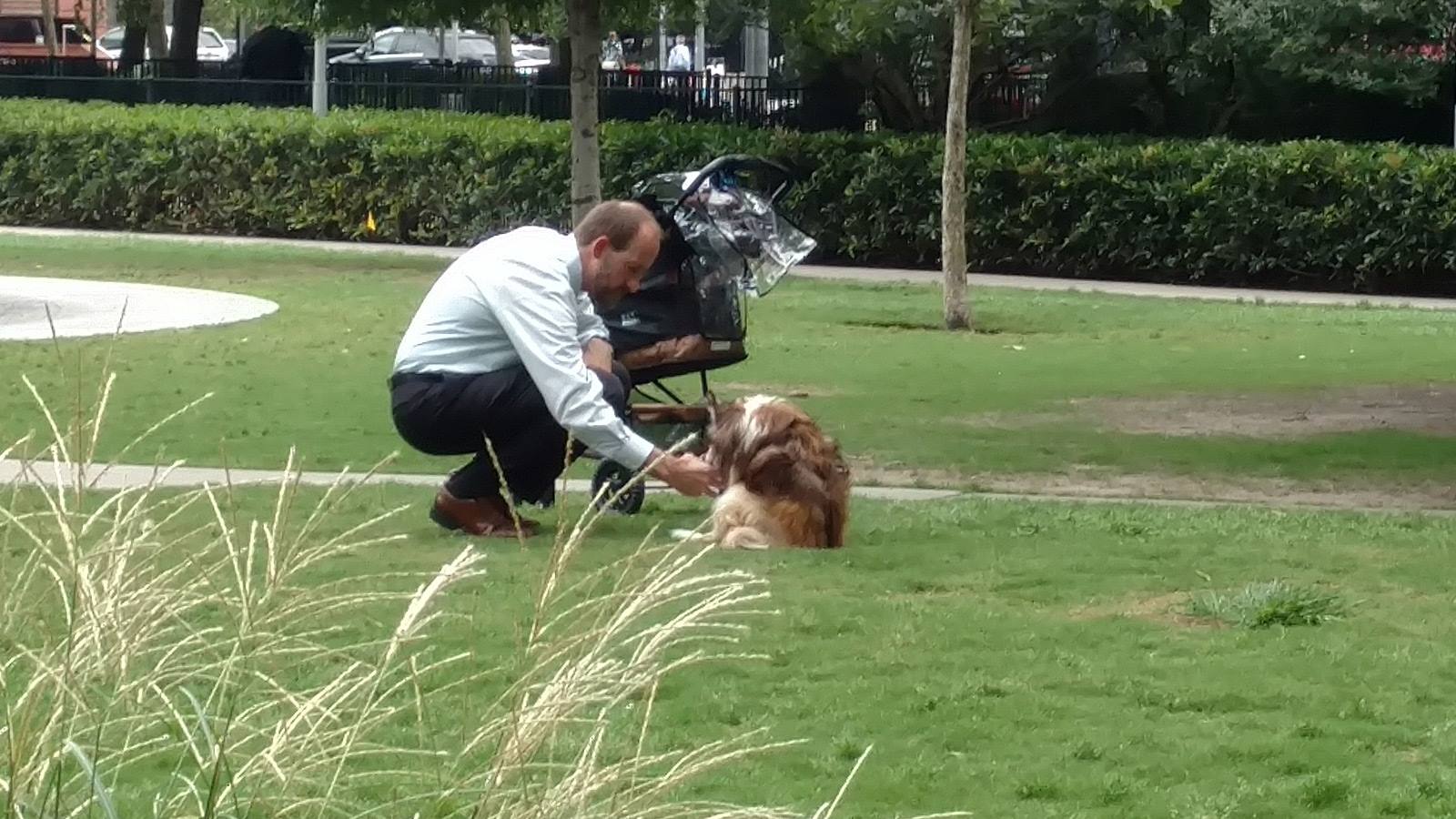 A nice guy kneeling down to help a dog, and a baby stroller without baby! That what was in Doug’s photo.