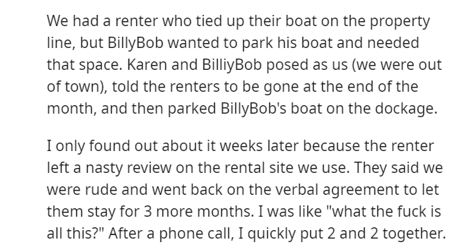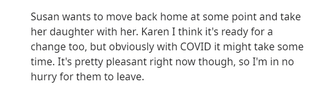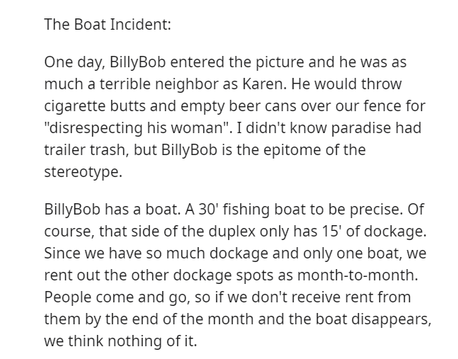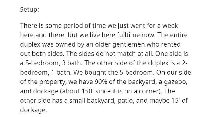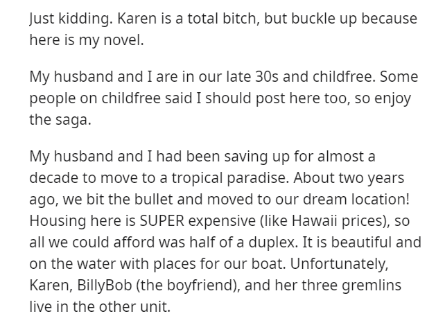 Having procured a dwelling in a tropical paradise, the Redditor and their spouse embarked on duplex living, sharing the abode with Karen, her offspring, and her significant other, Billybob.