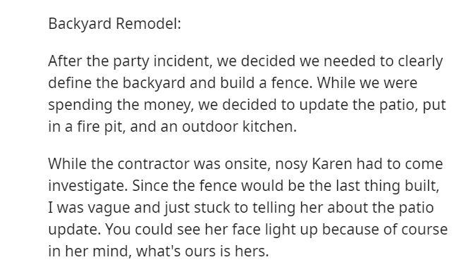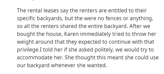 Despite separate backyards, the absence of a fence led to the duplex occupants sharing the space, a dynamic that Karen took undue advantage of.