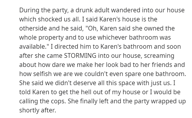 Trouble multiplied when an inebriated adult strolled into the Redditor’s residence, claiming permission from Karen to use their bathroom. A swift redirection to Karen’s quarters led to a blazing confrontation.