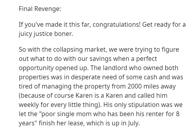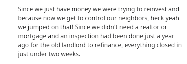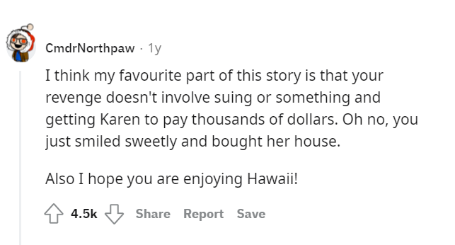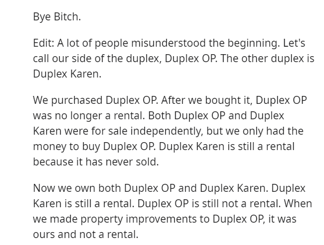 Retribution finally manifested when the Redditor seized the opportunity to purchase the entire duplex, effectively gaining control.
