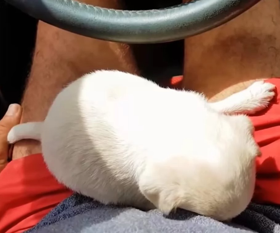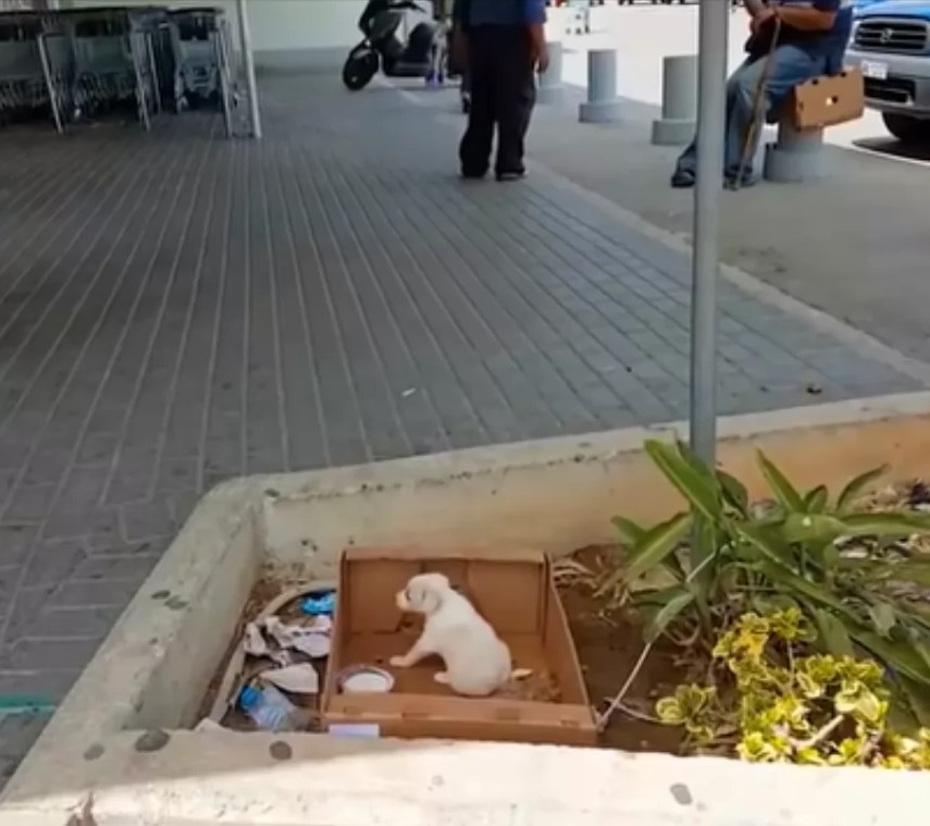 A white puppy can be seen sitting in a bare cardboard box outside a supermarket in the video. According to the shelter, someone left this poor dog here in the hopes that shoppers would support her and maybe adopt her. Unfortunately, no one seemed to notice her.
