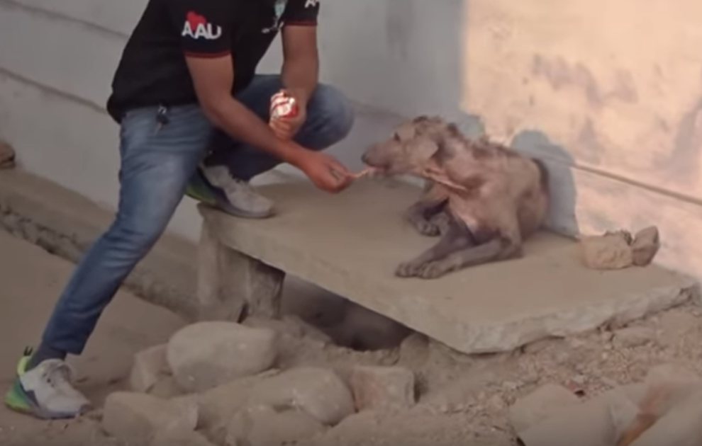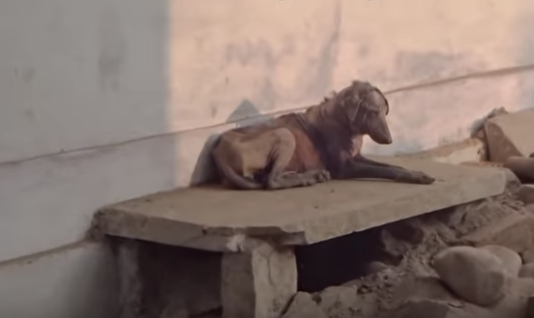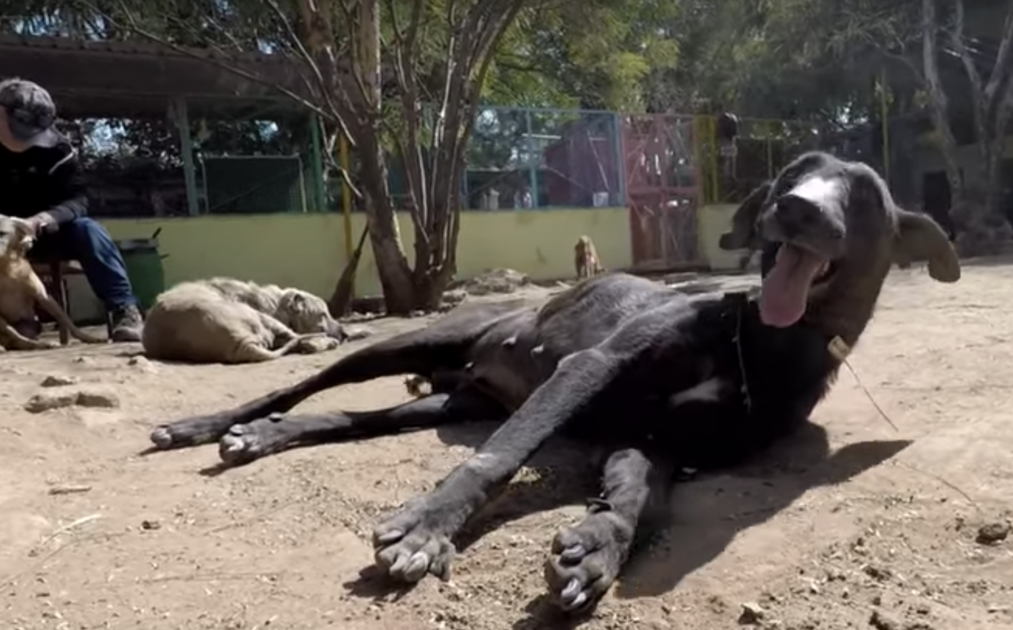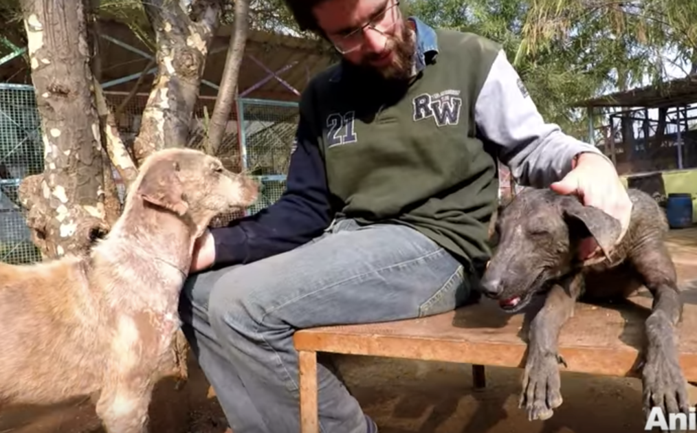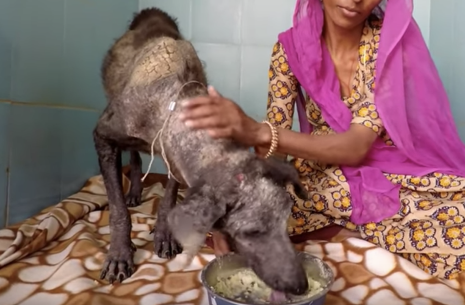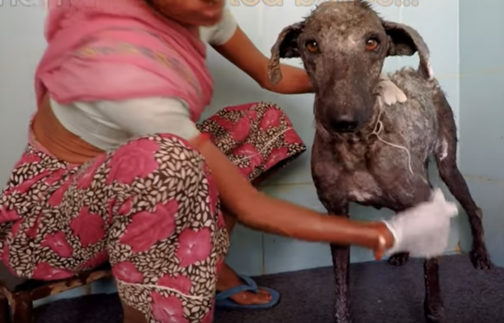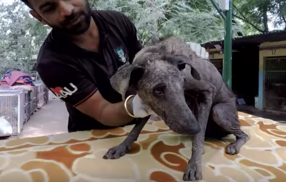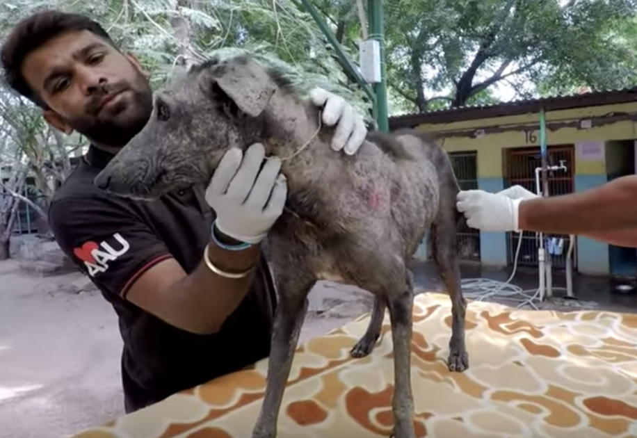Safely back at the Animal Aid sanctuary, the sweet dog was evaluated. The video says that “her eyes were filled with sorrow,” likely because she had only known a life filled with pain. Well, that was all about to change. The poor girl was covered in skin that was so badly cracked, she hardly had fur left on her.
