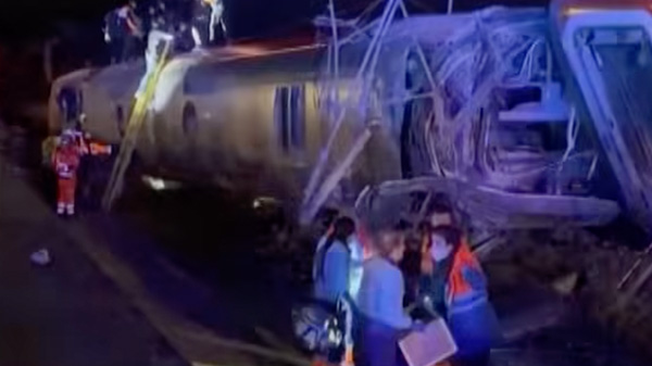 Footage from the scene shows train carriages tipped over. Rescue workers can be seen scanning the train to pull people out of the train doors and windows.