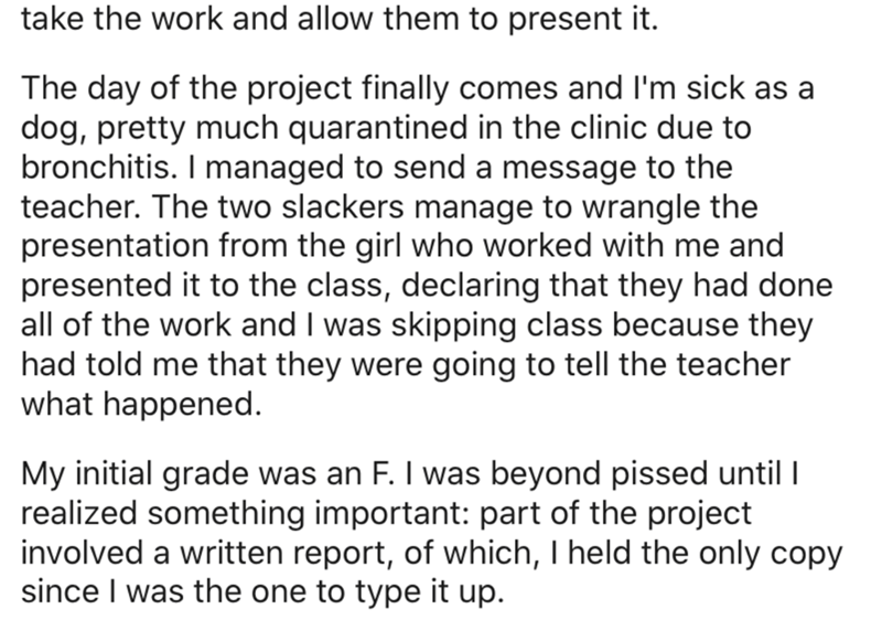 Curious as to how? Look no further than the protagonist of the tale shared below. Ensnared in a group project alongside a clique of sluggards attempting to seize credit for his substantial contributions, he masterfully turned the tables on them.