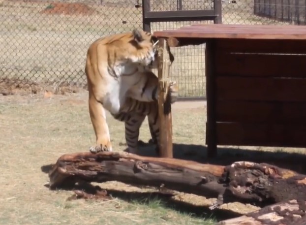His new bigger enclosure at the LIONSROCK Lodge & Big Cat Sanctuary is right next to this one, so he is not going through another stressful journey. Whenever he is ready and relaxed enough that we can open the gate, he can easily walk through it and enjoy his permanent home. By the way as you can see in the video, it seems Laziz is quite into wood. We can’t really say why, but we guess it’s because he never felt wood before.