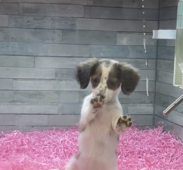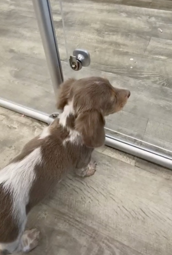 A sweet little Dachshund located in another pen saw her take his best little pal out of the pen and walk away. The tiny pup’s heart was broken as he pleadingly pawed at the window as if to say, “Please don’t take my best friend away or at least take me with you!”