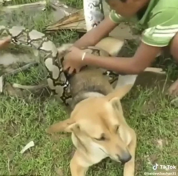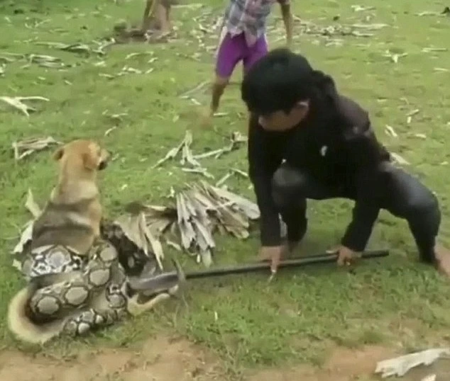 Brave boys fight off big snake with sticks and leaves after it wraps itself around pet dog and suffocate him
