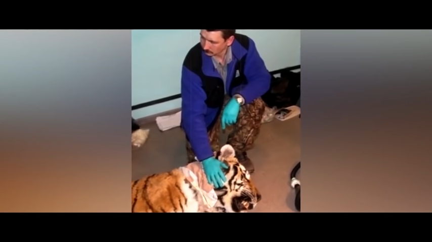 The pet followed him as if they were friends, when they entered, the paramedic took the noose off and started cleaning up the wound. Despite being in pain, the tiger let it all happen and did nothing other than reject the food that was brought to him.