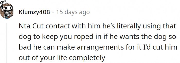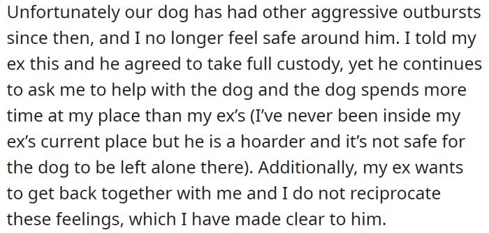 I feel sorry for the dog, but it seems they can’t pinpoint the issue. Hopefully, a trainer can help him, or he may become a threat, leading to euthanization. It appears the ex might just be upset that he won’t have a reason to meet with her anymore, and the dog became an excuse.